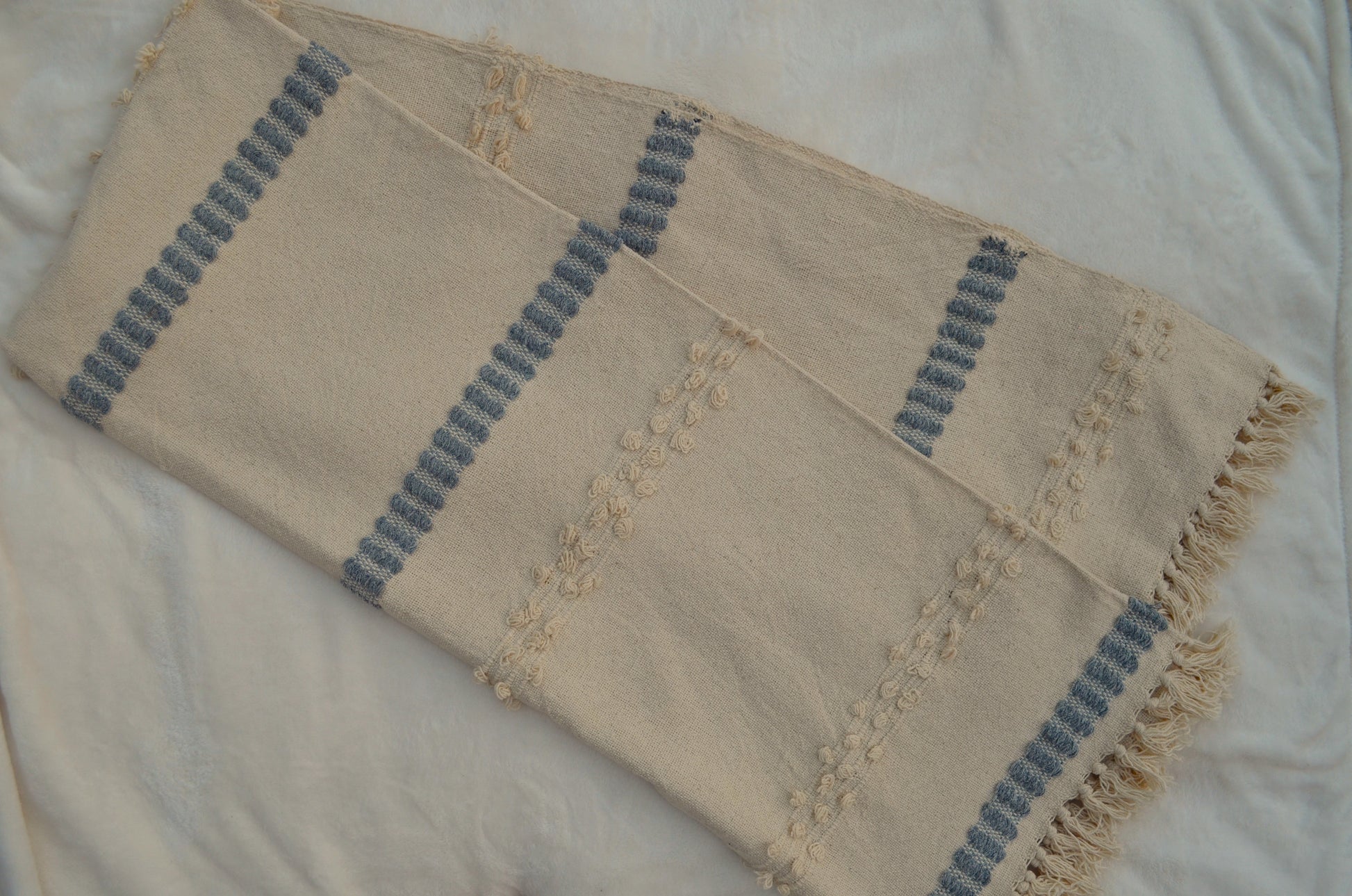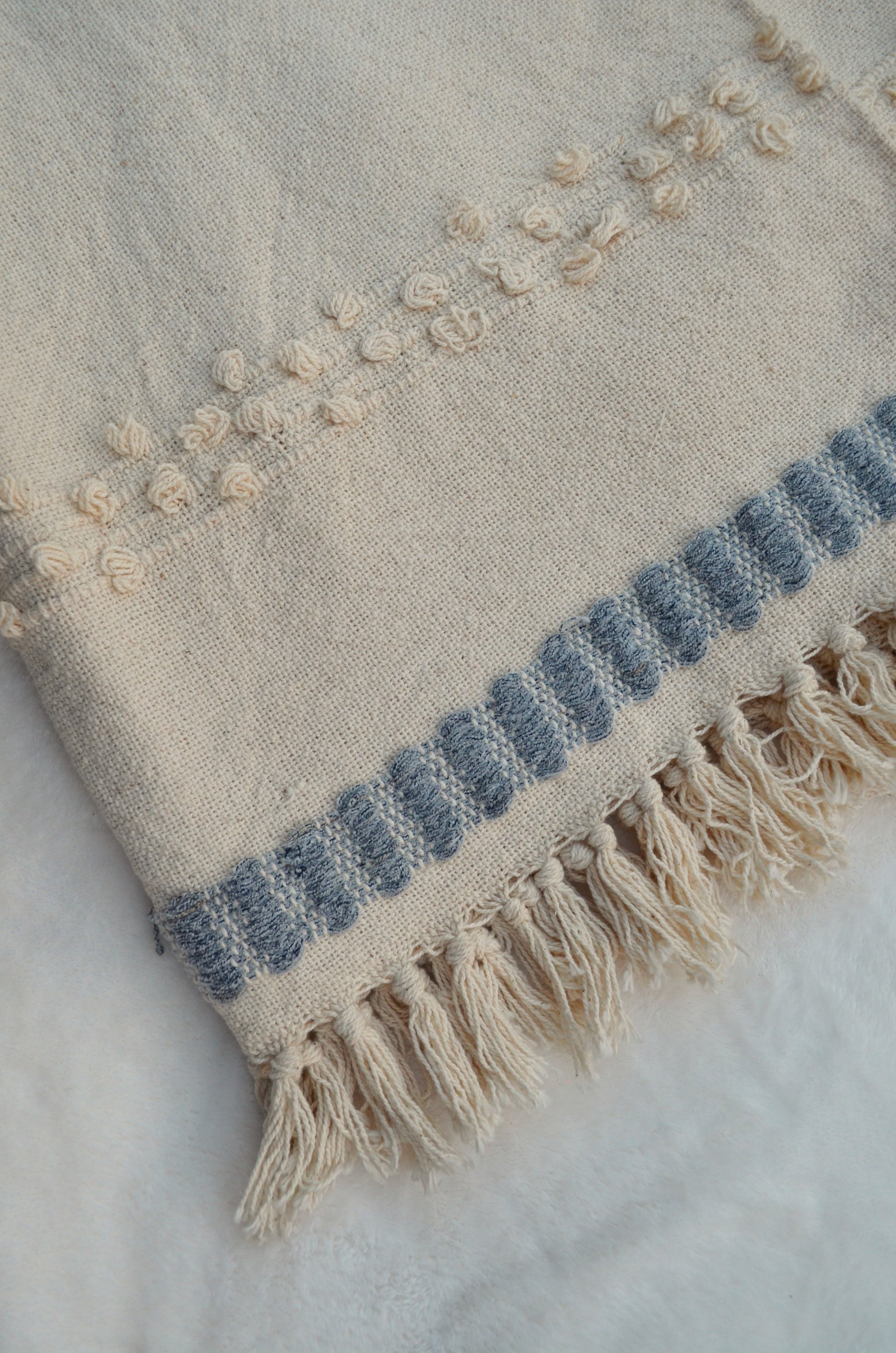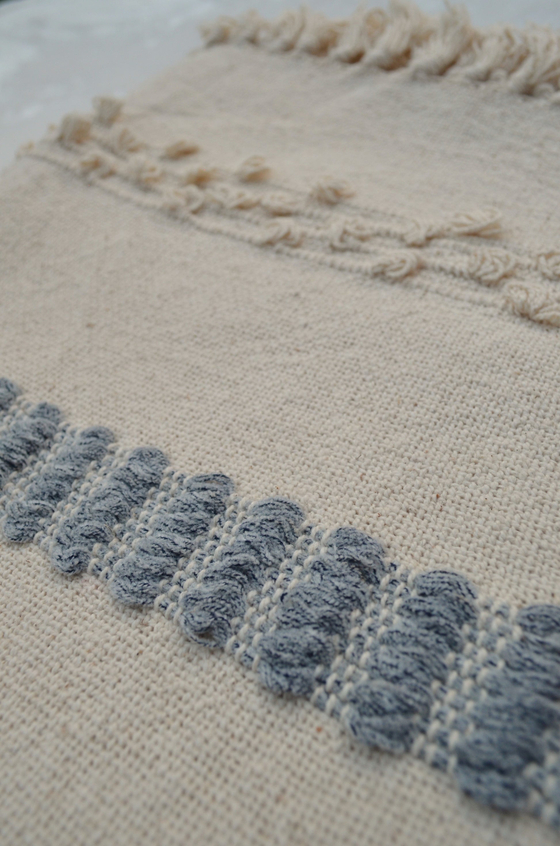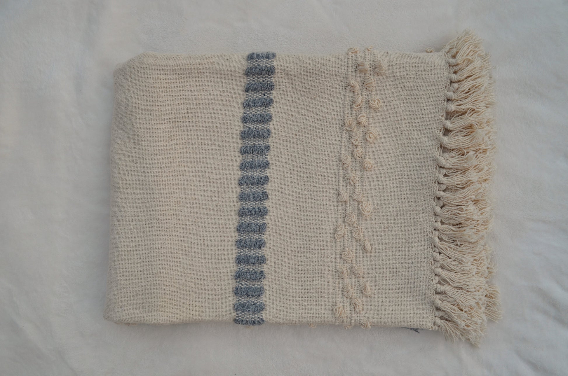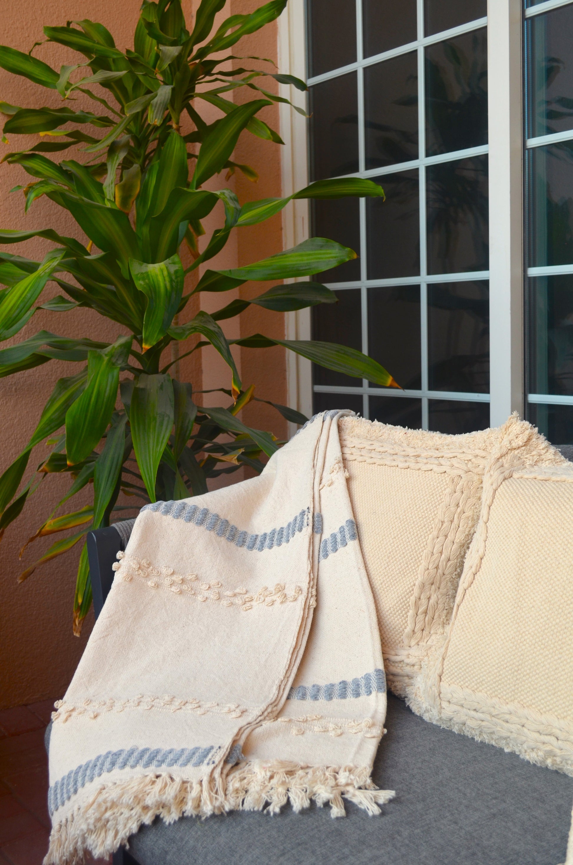 Handmade 100% Cotton Linen Tufted Throw Blanket complete with fringed tassels on the corners. Perfect for creating a relaxing, boho-styled space.