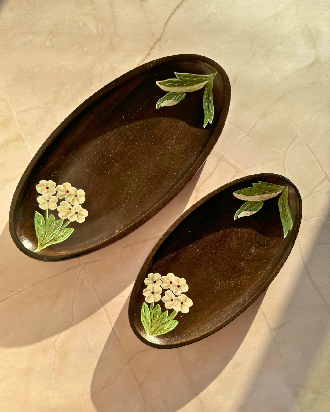 Experience the elegance of nature captured through hand-painted designs on everyday objects. This set of two oval-shaped platters, crafted from mango wood.